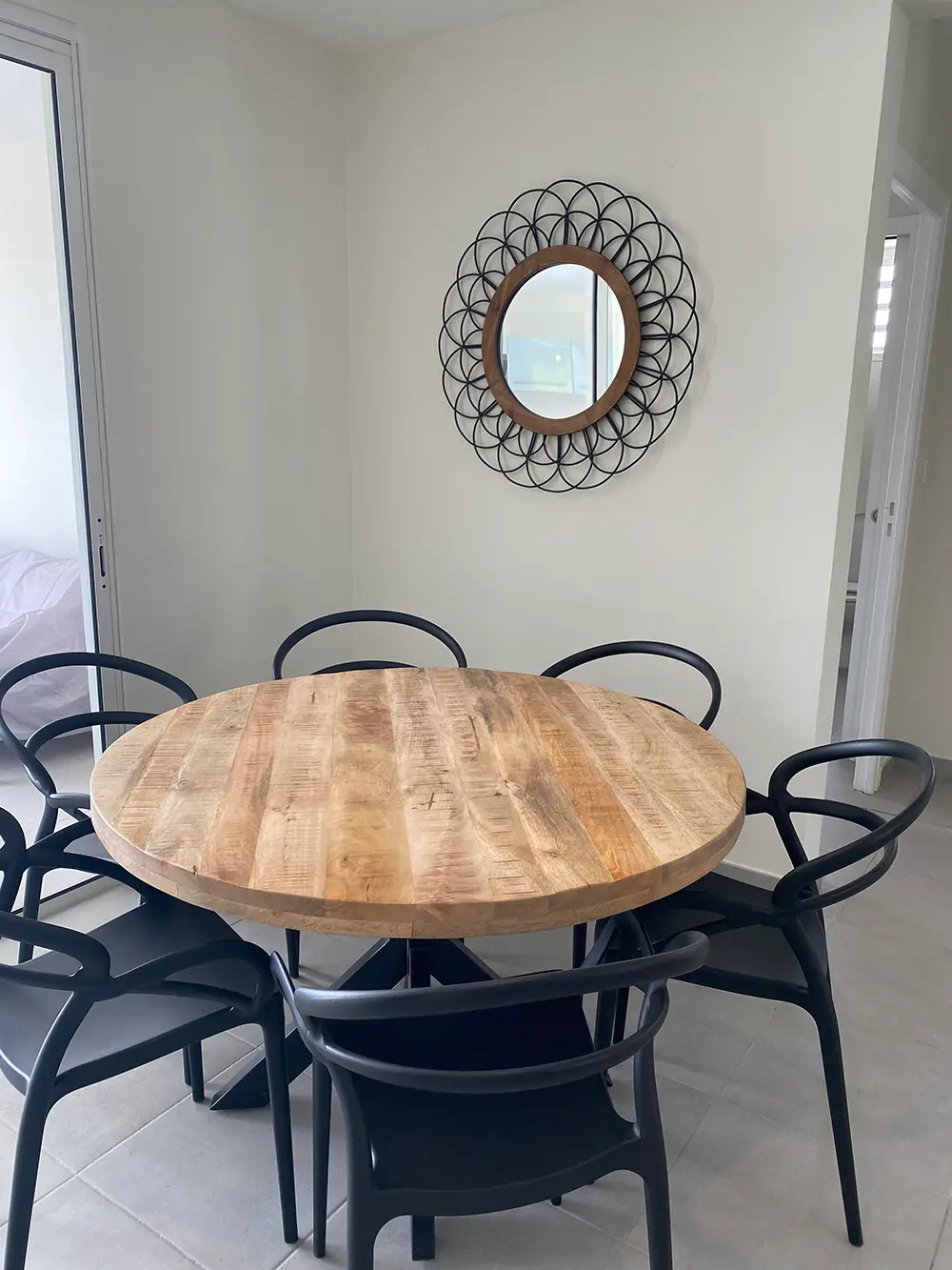 La spacieuse salle de séjour vous invite à vous sentir à l’aise et à vous détendre. Le canapé confortable et moderne peut également être utilisé comme couchage pour une 5ème personne. La table à manger ronde en bois massif, sera parfaite pour vos repas en famille ou entre amis.