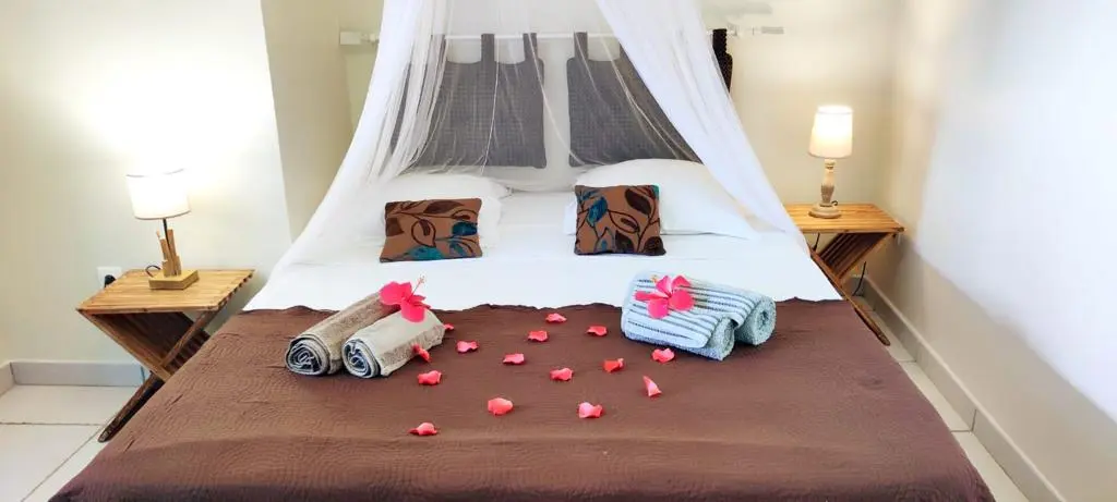 La Villa Makandja A possède 3 grandes chambres climatisées et spacieuses, une chambre parentale (literie de 180 × 200) avec SBD et WC. Une chambre (literie de 180×200), et une chambre avec un lit superposé (140×200 et 90×200), toutes les chambres sont équipées d’un placard mural.